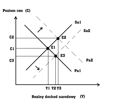 Krzywa popytu Pa1 przecina się w punkcie równowagi gospodarki E1 z krzywa podaży Sa1, przy dochodzie narodowym Y1 i poziomie cen C1. W wypadku wzrostu popytu, spowodowanym przykładowo przez wzrost plac, lub innego źródła wzrostu ilości pieniędzy w obiegu następuje przesuniecie krzywej do Pa2, poziom cen wzrasta do C2, ustala się nowy punkt równowagi E2. W odwrotnym przypadku gdy podaż nagle wzrośnie, wówczas krzywa Sa1 przesuwa się do Sa2, ceny spadają do punktu C3 dochód narodowy wzrasta do Y3.